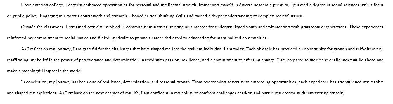 In the conclusion of a personal statement, the applicant strives to leave a lasting impression while reinforcing the central themes and messages conveyed throughout the narrative. It is an opportunity to reflect on the journey articulated within the statement, summarizing key experiences, achievements, and aspirations. By revisiting the overarching purpose of the statement, the conclusion aims to leave the reader with a sense of closure and conviction regarding the applicant’s suitability for the opportunity. Moreover, it may include a final reflection or statement that underscores the applicant’s readiness, enthusiasm, and commitment. Ultimately, a well-crafted conclusion serves to leave a memorable final impression, compelling the reader to consider the applicant as a strong candidate worthy of further consideration.