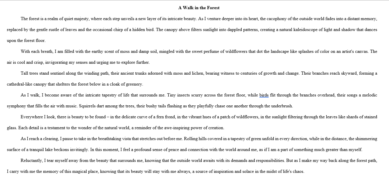 Additionally, figurative language such as metaphors, similes, and personification are employed to infuse the narrative with depth and emotion, allowing for a more profound connection between the reader and the subject. At its core, a descriptive essay is a finely crafted exploration of the world around us, inviting readers to see, feel, and experience the wonders of life through the eyes of the writer.